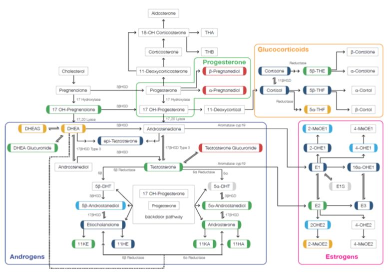 This thing up above is an actual unretouched image of a steroidogenic pathway diagram. It’s not even remotely edible but it does show how the various steroid hormones we make interrelate and also shows relatively how much of each steroid is present at a given point in time. I call it a steroid heat map.