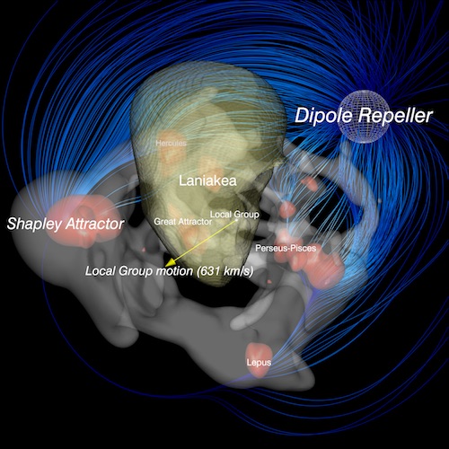 Anyway, there’s a point in all this. It turns out that our Milky Way (in the Local Group) is stuck out at one edge of Laniakea. Maybe they should have called it the Milky Whoa Dude, You’re A Long Way From Kansas. This diagram might help though, if you ever get lost out there.