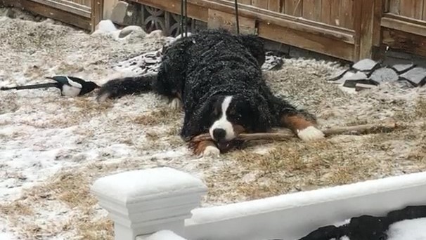 Not that I’m bragging, but it’s quite possible that I have the only footage in existence featuring a magpie plucking hair from the tail of a plus-sized 9.5-month-old Bernese Mountain Dog.