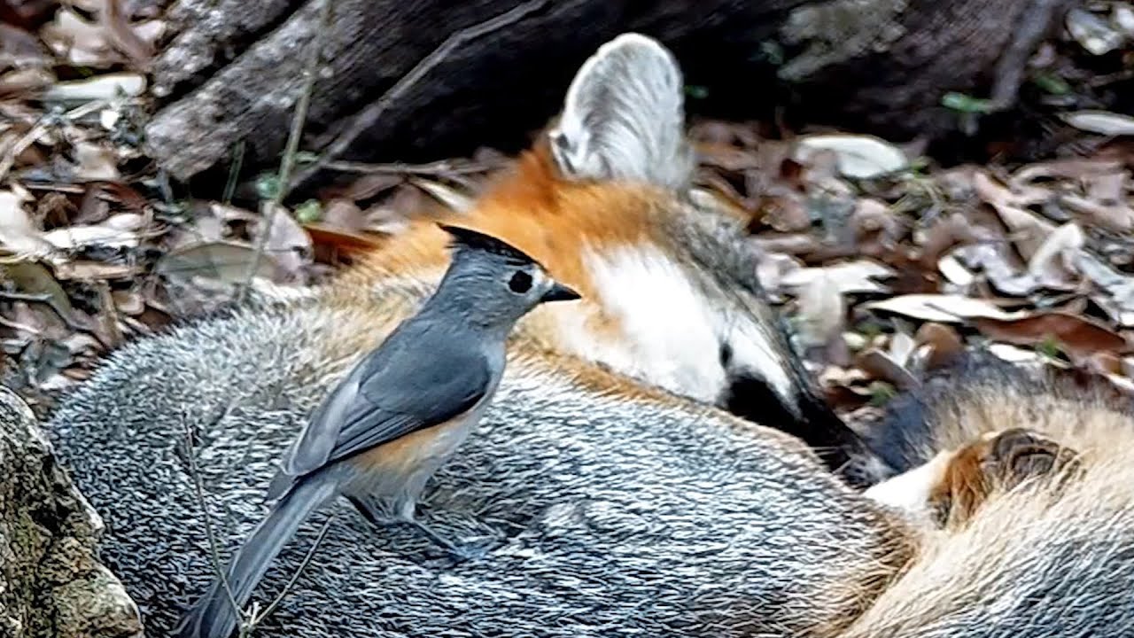 Here is an actual unretouched photo of a titmouse (in foreground) thinking hard about depilating a sleeping red fox: