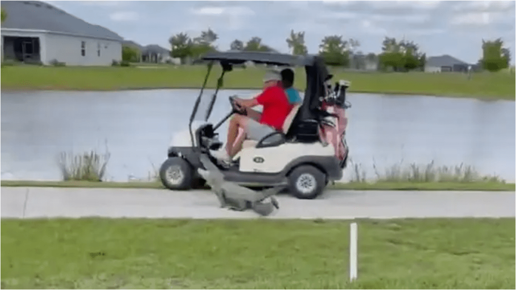 I have a theory about all this and my theory is as follows: we are looking at two different events here. The people in that cart have probably trained TWO alligators. One of the alligators is grumpy and likes to chase golf carts. The other alligator is more friendly and docile. The cart people sent out a scout cart to stir up the grumpy gator, then followed the scout cart in their cart, which was equipped with at least one pink golf bag.
