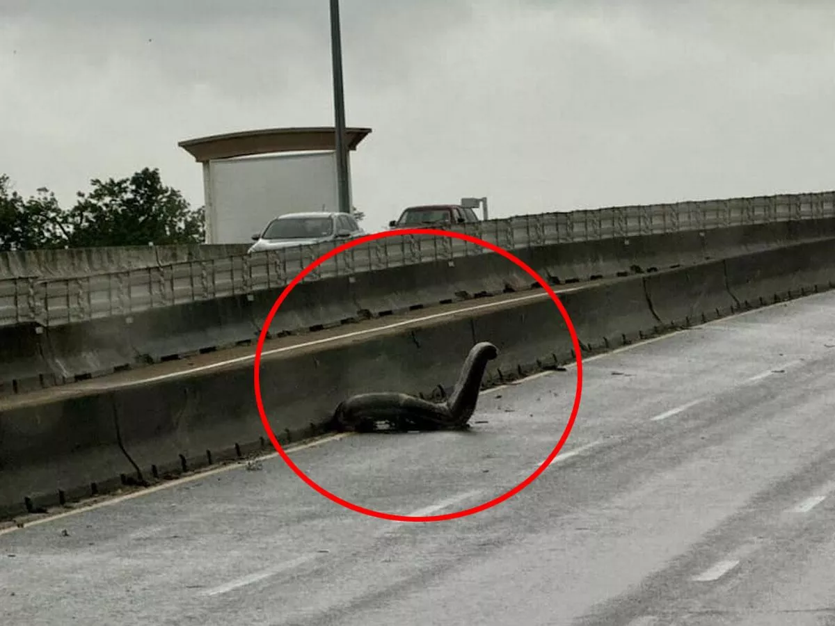 Sure enough, after Beryl headed northeast, toward the RNC, reports started coming in on July 8th saying that what appeared to be a juvenile offspring of the Loch Ness Monster had been deposited on the Texas I-45 interstate.